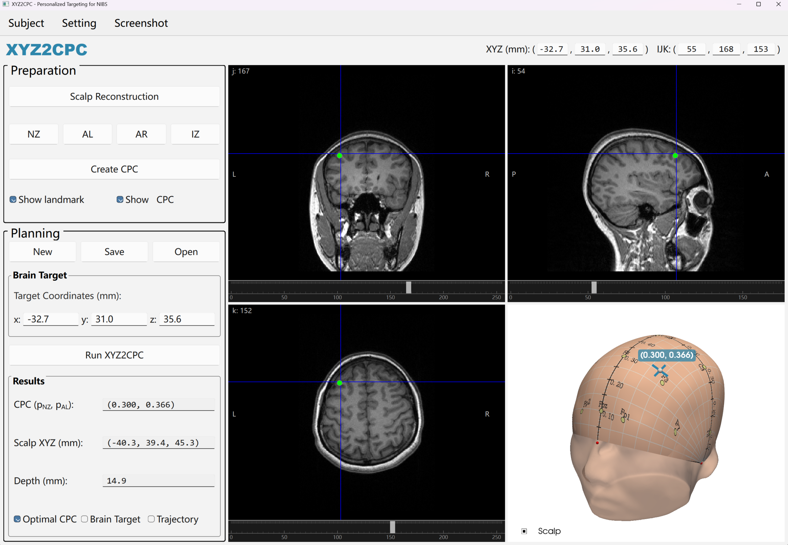 XYZ2CPC is a personalized transcranial magnetic stimulation (TMS) target planning software designed to provide clinicians and researchers with a practical solution for individualized TMS targeting without the need for neuronavigation equipment. The core function of the software is to convert individual brain target coordinates (XYZ) into Continuous Proportional Coordinates (CPC) on the individual scalp surface. Using these CPC coordinates, operators can quickly and precisely locate personalized cortical targets through simple tape measurements on the scalp.